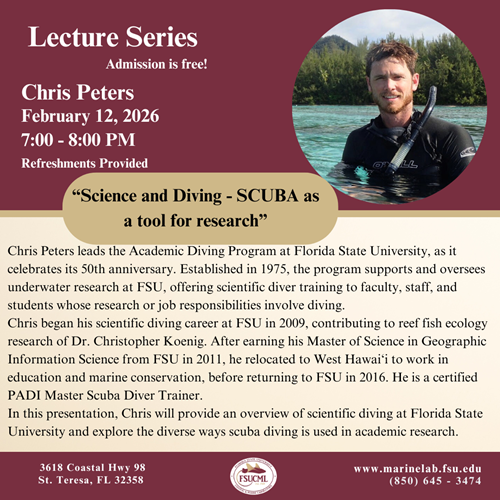 Join us for our 2025 Fall Lecture Series beginning in October, one way in which the FSUCML reaches out to the community to enhance global coastal & marine literacy in Florida. Open to the public, lectures take place from 7 until 8 PM in the FSUCML Auditorium.